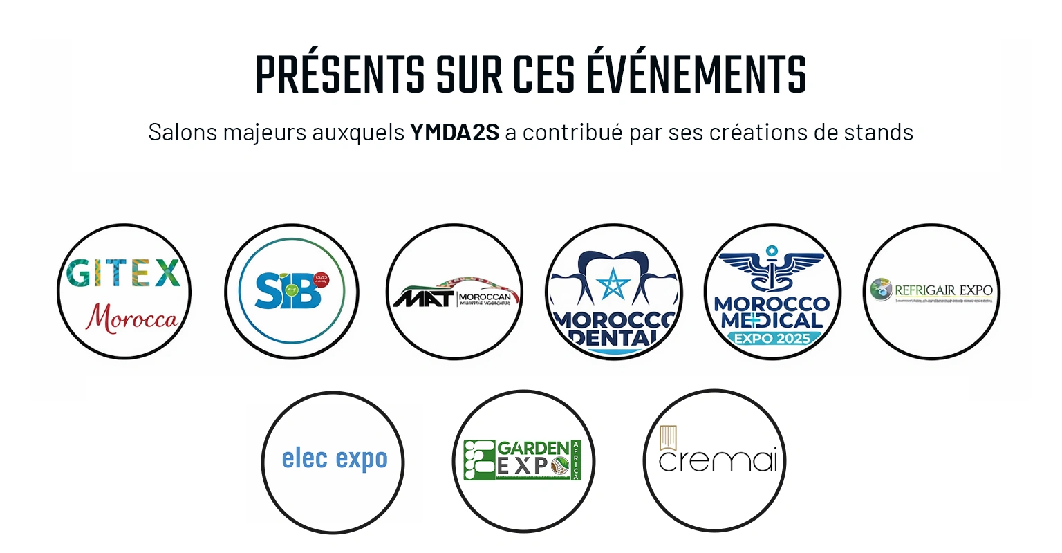 YMDASS a accompagné de nombreuses entreprises dans la conception de stands, l’aménagement d’espaces professionnels et l’organisation d’événements à travers le Maroc.